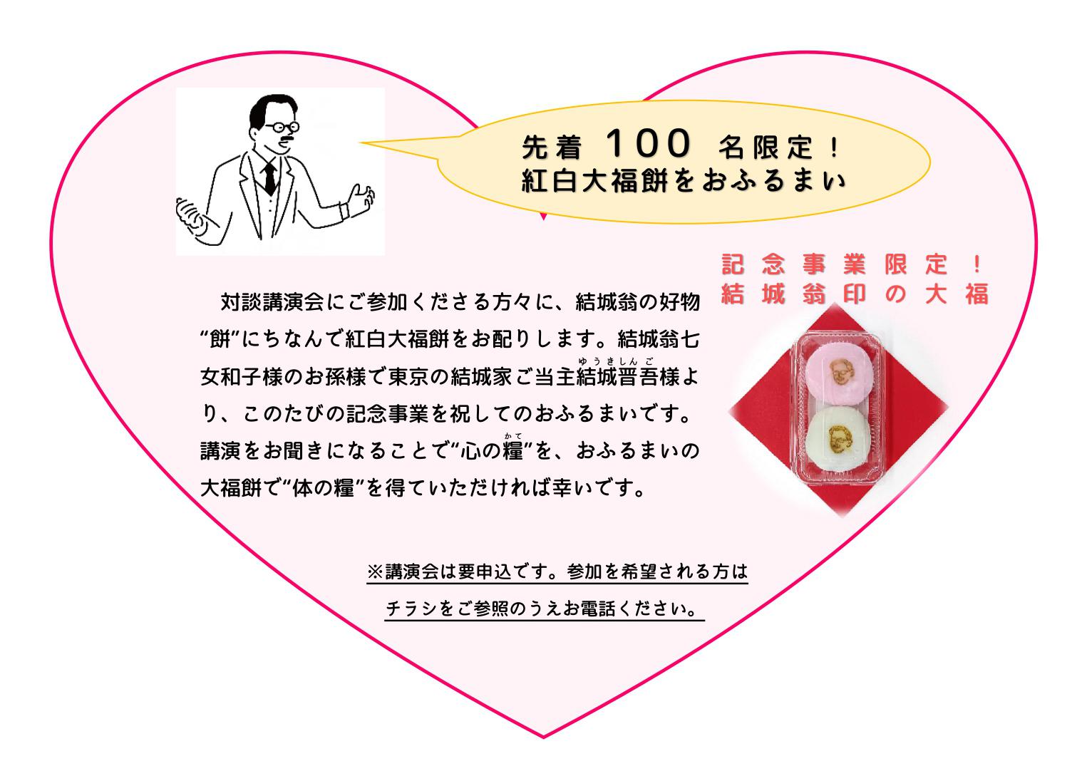 結城翁じるしの紅白大福餅をおふるまい!対談講演会にぜひご参加ください