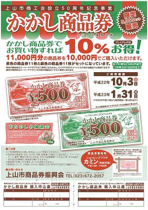 上山市商工会では、10%プレミアム付上山市共通商品券「かかし商品券」を販売しておりましたが、11月3日(水)に完売いたしました。