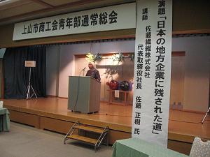 上山市商工会青年部の主催により、佐藤繊維株式会社代表取締役社長 佐藤正樹氏を講師に迎え、5月6日(金)に月岡ホテルにて講演会を開催しました。