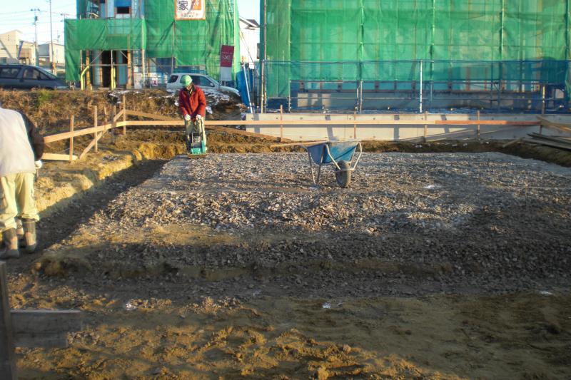 強固な地盤にする為に、砕石を敷き転圧しています。