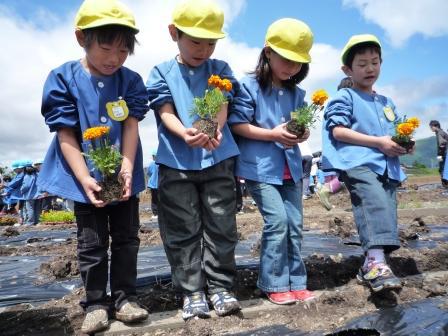みんな並んで花の苗をもらい植えるまで一列に。