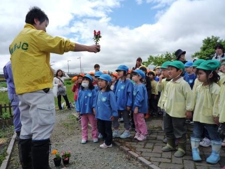 長井市内の保育園、児童センターの園児や保護者が最上川河川敷公園の花壇に花の苗を植えました。