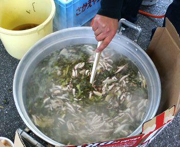 豚肉、しいたけ、タケノコが加わり煮込みます。