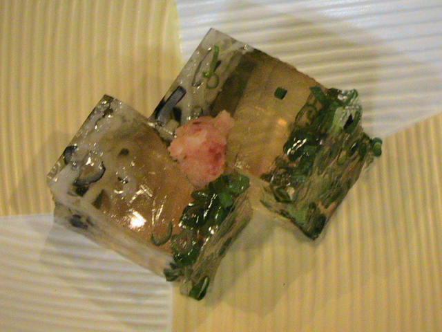 お通しの「ふぐ皮煮凍り」です。