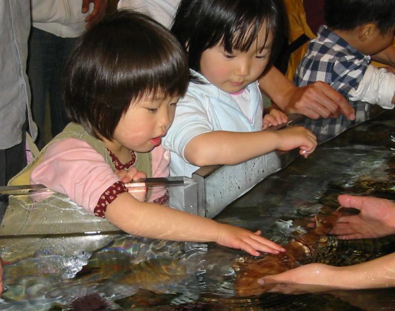 画像は、タッチング・プールでネコザメをなでなでしているムスメ。やっぱザラザラしてました。