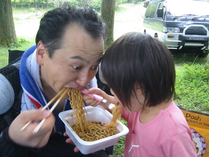 画像は、お昼ご飯のカップ焼きそばを貪り食う親子の図。