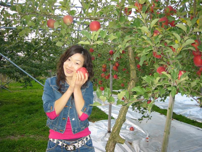 画像は実家(奥さんの)のリンゴを収穫する奥さん。