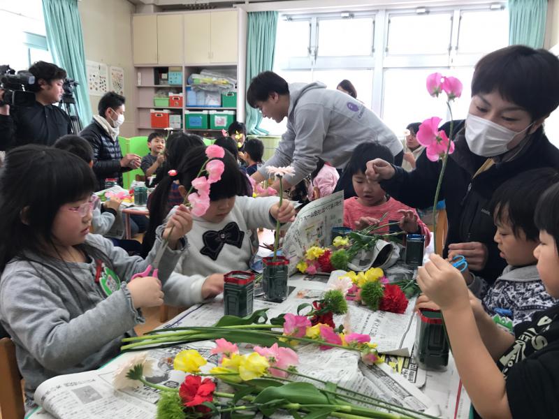 白鷹町の愛真こども園にて、ひまわり組のみんなとフラワーアレンジメント体験!
