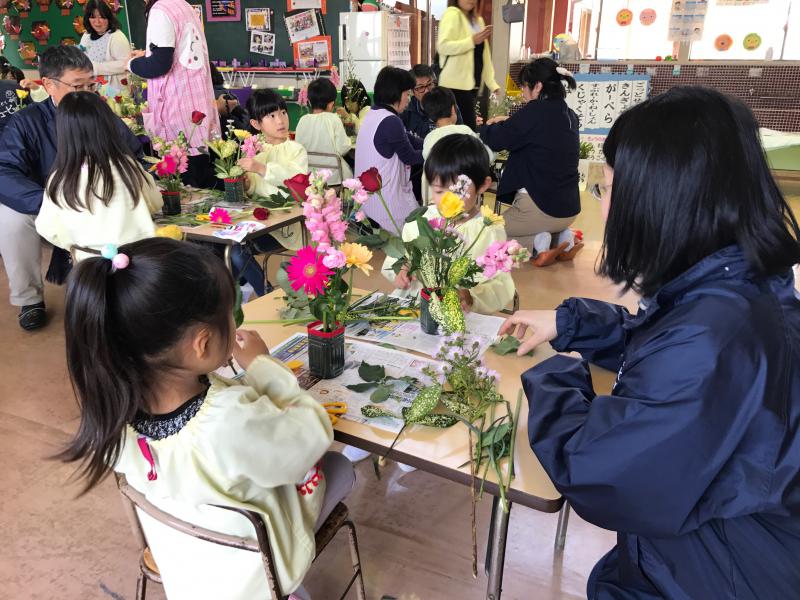 ▼幼稚園にて花育事業。フラワーアレンジ体験です。(^O^)