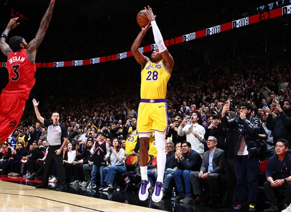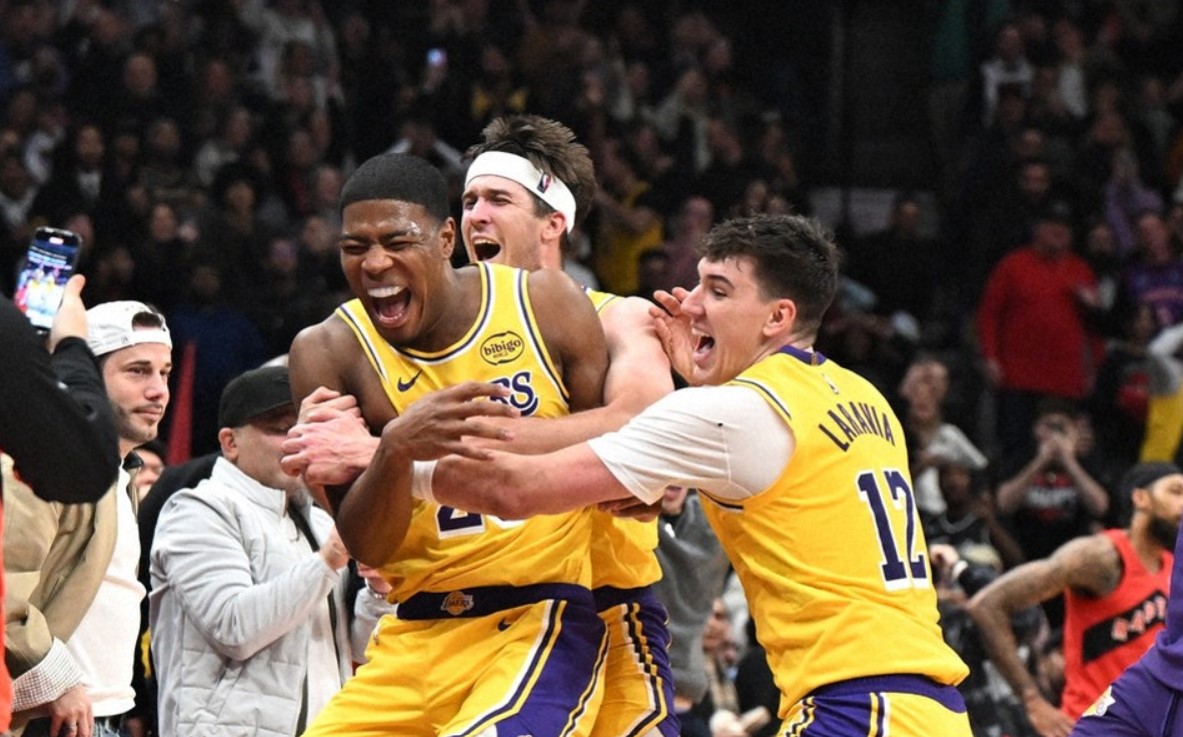 ブザーとともにボールはリングに吸い込まれ、レイカーズは劇的な勝利を手にしました。