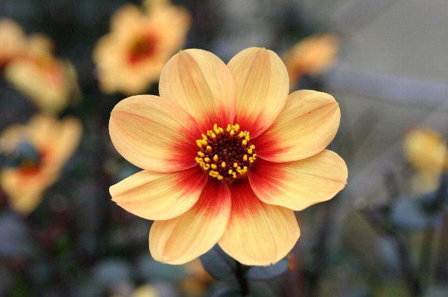 はじめに『シングル咲』です。コスモスのように一重に咲くダリアで、ダリアの野生種(原種)の多くがこのタイプでした。その中から二重に咲くもの、八重に咲くものが生まれ選抜され、完全な八重咲き種に進化してゆくのです。