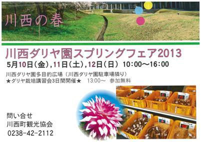 ダリアの球根販売会「川西ダリヤ園スプリングフェア2013」が、今週末開催されます。通信販売以外では、国内で最大級(200品種程度)の販売会です。栽培講習会なども開催されますので、来場いただきたいと思います。