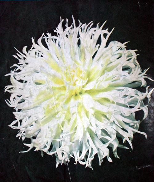 花径:中大輪(20p程度)、花型:STC−L(ストレートカクタス、フリル咲き<花弁の先が裂ける>)、花色:純白色、草丈:中高性