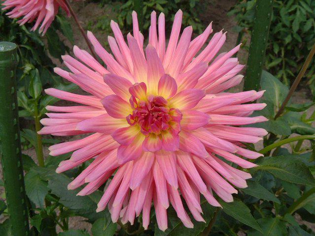 花径:大輪(large,27cm前後)、花型:IC(インカーブド・カクタス)、花色:ピンクと黄色の複色咲(light blends pink and yellow)、草丈:中性(1.2m程)、作出:1991年、米国