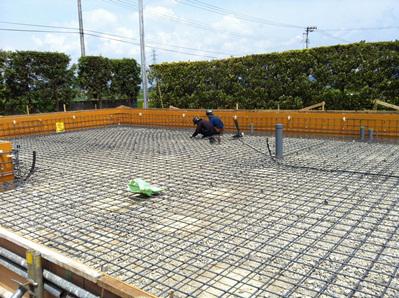 配筋工事が終わると次に枠をつくり、そこへコンクリートを流し込んで基礎がつく