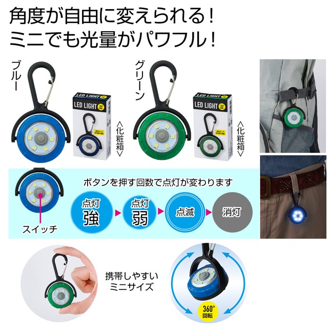レジャーや防災シーンだけでなくお子様の通学カバンにも付けておきたい小型のライト。盤面が360°回転するのでフレキシブルに照らせます。ボタンを押すたびに3段階で切り替え可能(点灯強→点灯弱→点滅→消灯)。