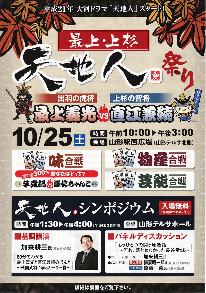 10月25日に山形で行われた「天地人シンポジウム」に行ってきました。会場の外ではテント村が立ち、ゆかりの地の特産品即売会や兼続のマスコット「かねたん」等によるPRでにぎわっていました。