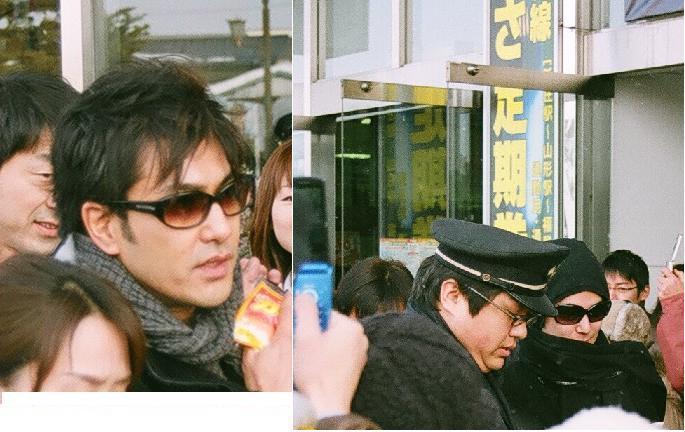当日は米沢にしては、温かく陽がさす中、100人ほど集まった女性ファンはわくわくドキドキでその時を待っていました。そして、キャーッという歓声の中に現れたのは、残念、同じ新幹線に乗っていた一般のお客様。ため息と笑いが起こるハプニングにその場が和んだ時、黒いニット帽にサングラス、口まで覆う黒のマフラー姿の妻夫木さん。ほとんど誰かわからない姿なのに放つオーラはさすがでした。そして、すこし後を使い捨てのカイロを手にした素の北村さん! テレビと変わらぬニヒルな二枚目に思わずうっとりです。