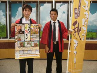 ハッピと秋まつりののぼりを持って。
