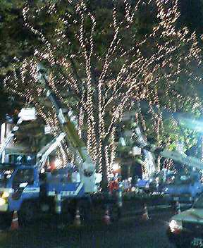 仙台での出張中、食事し終わって、深夜にホテルへ帰る途中、仙台の有名な光りのページェントの取り付け点灯作業をしてました。