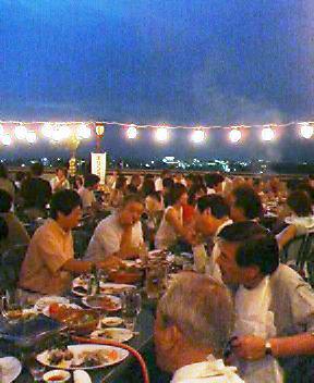 ビアガーデン。ここは米沢牛の金剛閣。平日なのに大賑わい。焼き肉と海鮮バーベキューでした。
