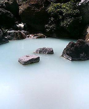 見てください、この露天風呂のお湯の色!乳白色じゃなくて何て言うんだ、青がまざったきれいな色してます。