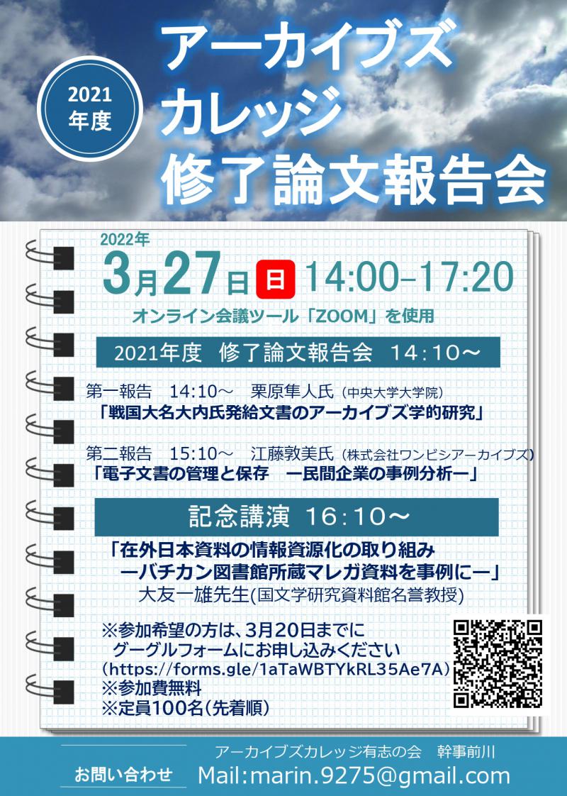▼2021年度アーカイブズカレッジ修了論文報告会のお知らせ
