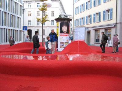 街一角、赤いカーペット。