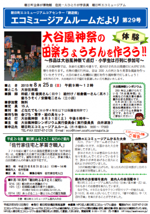 250年以上続けられている「大谷風神祭」は、台風などの風水害を鎮め豊作を祈る夜祭りです。9月29日(日)大谷の方々と文教大学の菊池和博教授をバネラーにシンポジウムを開催予定。あわせてご参加下さい。