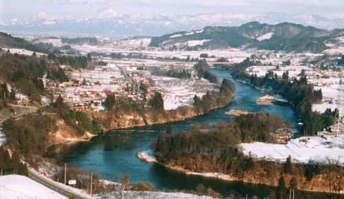 五百川峡谷ビューポイント。「元禄時代に書き綴られた『大谷往来』の風景と変わりなく滔々と流れる最上川が眼下に見える。」
