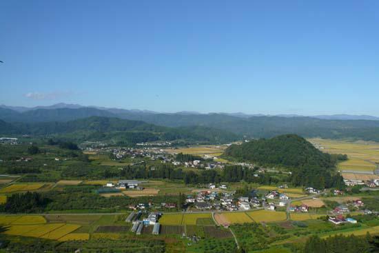 明神断崖(用のはげ)頂上の厳島神社裏から朝日連峰大朝日岳を正面に、美しい朝日町の風景を眺望することができます。足許に注意。