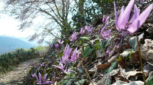 白倉集落からAsahi自然観に至る途中にカタクリ群生地があります。花の季節のみ一般に公開されています。可憐に咲く一面のカタクリに圧倒されます。例年ゴールデンウィーク頃が見頃です。