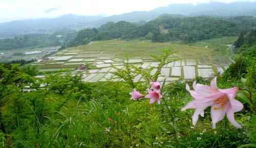 隣接する高台にある「一本松農村公園」では、町の花「ヒメサユリ」の保存に長年取り組んでおり、初夏、可憐に咲くやさしいピンク色の花々を眺めに多くの人が訪れます。この公園からは、棚田の全容を見ることができ、季節ごとに移り変わる水田の色模様を楽しむことができます。また、大朝日岳や暖日山、道円山などの山並みや最上川、周辺集落など、美しい朝日町の風景も眺めることができます。