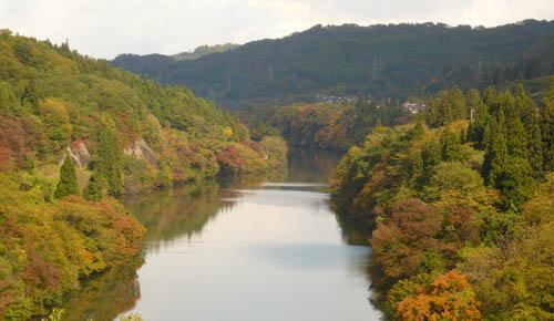 五百川峡谷ビューポイント。「松程へ向かう高台からの風景は素晴らしい。特に秋は水面に紅葉が映り落ち葉も浮かんでいてきれい」