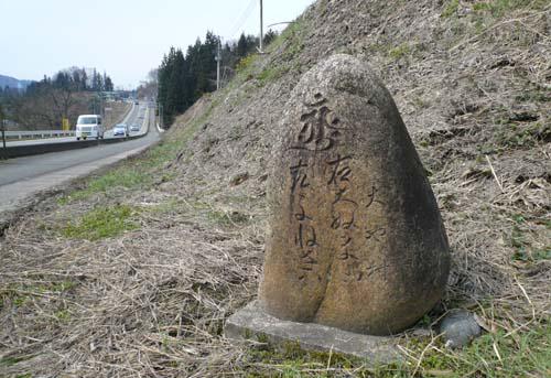 この追分石は、大沼浮島経由で出羽三山にお参りする人達のための道標でした。上部には大日如来(湯殿山権現)を表す梵字が記され、右側に文政5年壬午年(1822)大や村、中央に「右大ぬま山、左よねさハ」と刻んである。