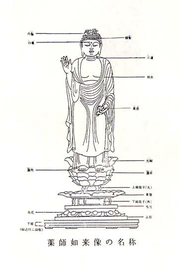 形状は、頭部が螺髪切子型で彫出し、肉髻は珠、白ごうは相を表わさない。納衣は両肩を覆い、左腕は垂下し、掌(たなごころ)を上にして薬つぼを持ち、右腕は屈臀(くっぴ)、掌を前にして立て五指を開き、やや左足先を外に開いて直立した形をとる。肩幅が広く堂々とした正面観をあらわし、衣文も流れるように美しいこの像は、願容がきわめて都ぶりのすぐれた藤原様式の典型的な表情である。