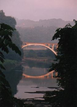 旧明鏡橋ができたのは、私が小学校を卒業するのと同じ年だったから、橋工事の様子や橋ができた時のことは良く覚えている。コンクリートを上げるタワーが高くそびえて、この静かな山村にゴーゴーと音が鳴り響いていた。子供ながらに、これは景気が良い、活気があるなと思っていた。