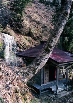石須部に至る橋を渡り下流に向かって少し下ると、河岸の林の中に不動尊の社が建っています。裏手には不動滝が流れ落ちています。朝日岳の山岳信仰が盛んだった頃、布山の修験者達がこの滝に打たれて身を浄めたところと伝わり、小さな滝ですが独特な雰囲気の漂う名滝です。
