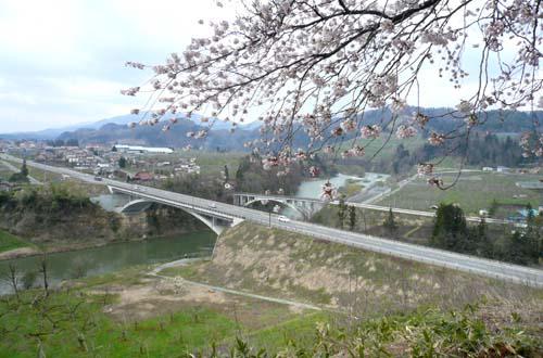 五百川峡谷ビューポイント。「新旧明鏡橋と朝日岳も見える。春は色とりどりに花が咲き、秋は大隅側川縁の紅葉がひときわ美しく、冬は霧氷が朝の光でキラキラ輝く」