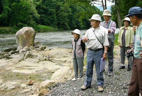 座学で最上川の最大難所だった五百川峡谷の開削と舟運について学んだあと、実際に難所跡の黒滝・佐の原・大滝・三階滝等を訪ねます。
