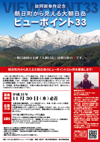山形県の唯一の国立公園は、磐梯朝日国立公園です。その朝日連峰の主峰大朝日岳山頂は、朝日町にあります。三角状の美しい姿は、町内各地から見られます。朝夕にその姿を眺めて、心をいやされている方も多いと思います。是非あなたの好きな、朝日町にある大朝日岳の見える場所を教えてください。皆で、大朝日岳ビューポイント三十三景をつくりましょう。