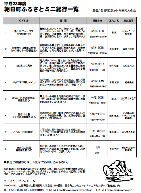 朝日町エコミュージアム案内人の会主催「朝日町ふるさとミニ紀行」の23年度年間予定が決まりました。普段は訪ねられない朝日町の魅力的なスポットを訪ねます。ぜひお誘いあわせの上ご参加下さい。