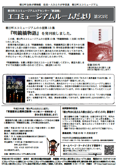 上記ダウンロードボタンで開きます。7月15日発行【内容】エコミュージアムの小径第13集『明鏡橋物語』の出版、DVD『みちのく異界遺産』の協力についてなど。