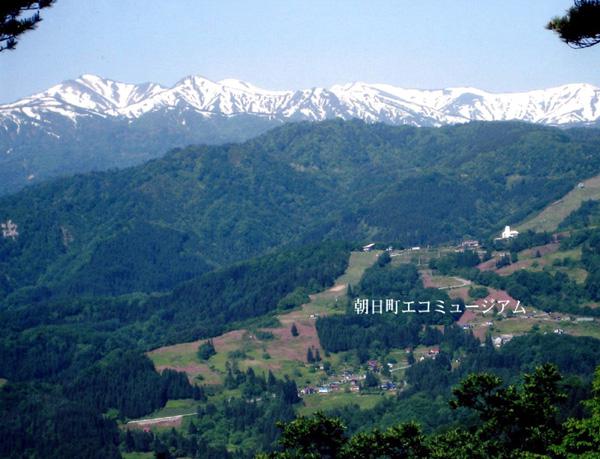 高田地区で整備した「ブナ林探索路」の西展望台からは、朝日連峰のパノラマを見渡すことができます。手前には白倉の集落とAsahi自然観も見えます。毎年ブナ林探索会も行われています。