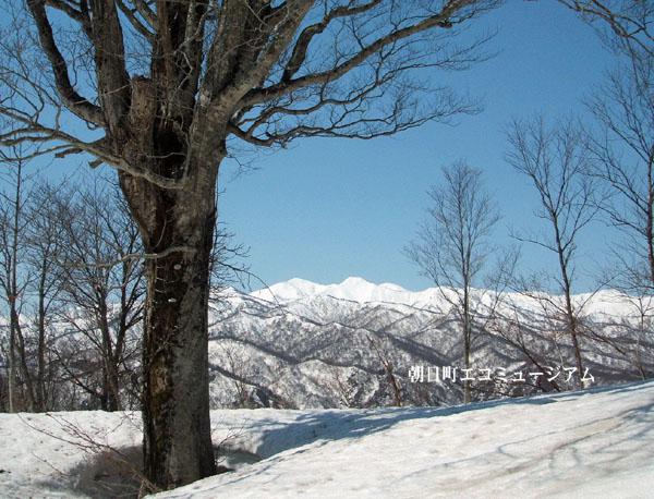 Asahi自然観の奥にある、サイヅチ峰のシンボルツリー「ほうきブナ」と大朝日岳が見える絶景のポイントです。春先には雪山トレッキングも行われています。