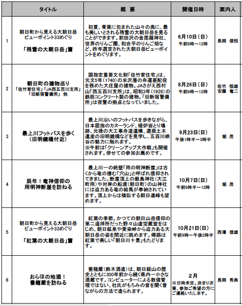 朝日町エコミュージアム案内人の会主催の見学会「朝日町ふるさとミニ紀行」が、今年も6回にわたり開催されます。普段は見られないポイントや住民講師の皆さんのお話も伺えます。この機会にぜひご参加下さい。