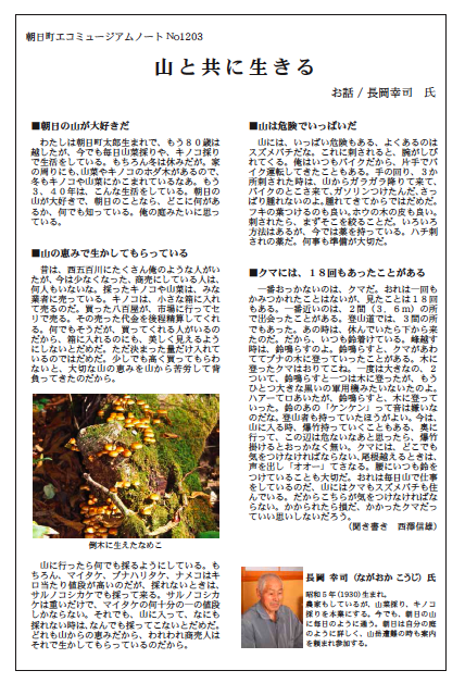わたしは朝日町太郎生まれで、もう80歳は越したが、今でも毎日山菜採りや、キノコ採りで生活をしている。もちろん冬は休みだが。家の周りにも、山菜やキノコのホダ木があるので、冬もキノコや山菜にかこまれているなあ。もう3、40年は、こんな生活をしている。朝日の山が大好きで、朝日のことなら、どこに何があるか、何でも知っている。俺の庭みたいに思っている。