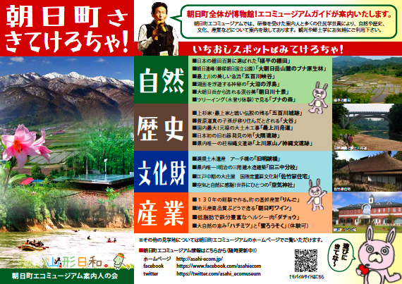朝日町の自然・歴史・文化・産業を博物館を見るように見学できる朝日町エコミュージアム。案内下さるエコミュージアムガイドのパンフレット「朝日町さきてけろちゃ」が完成しました。ガイドおすすめのコース紹介や16エリアの見どころが掲載されています。裏面の申込み用紙に、訪ねてみたい場所や日時を記入してFAXすると案内人や住民講師が手配されます。(1時間2000円 3時間4000円 一日6000円)朝日町を隅々までご案内いたします。ぜひご利用下さい。(A4三つ折り)