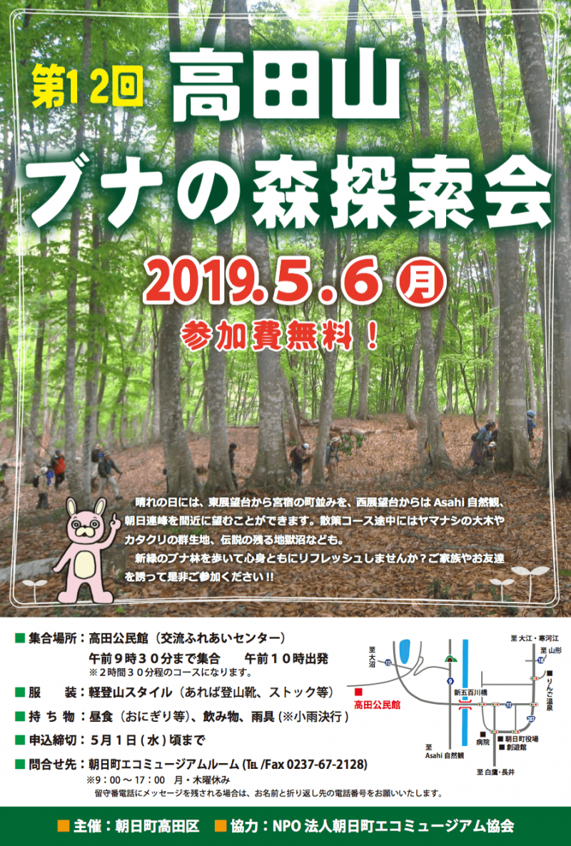 朝日町で最も身近なブナ林を、今年も地元高田地区の皆さんが案内して下さいます。