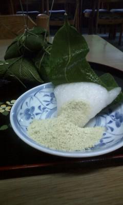 出来上がり。もっちりとした美味しい笹巻きが、きなこをまぶしていただきます。